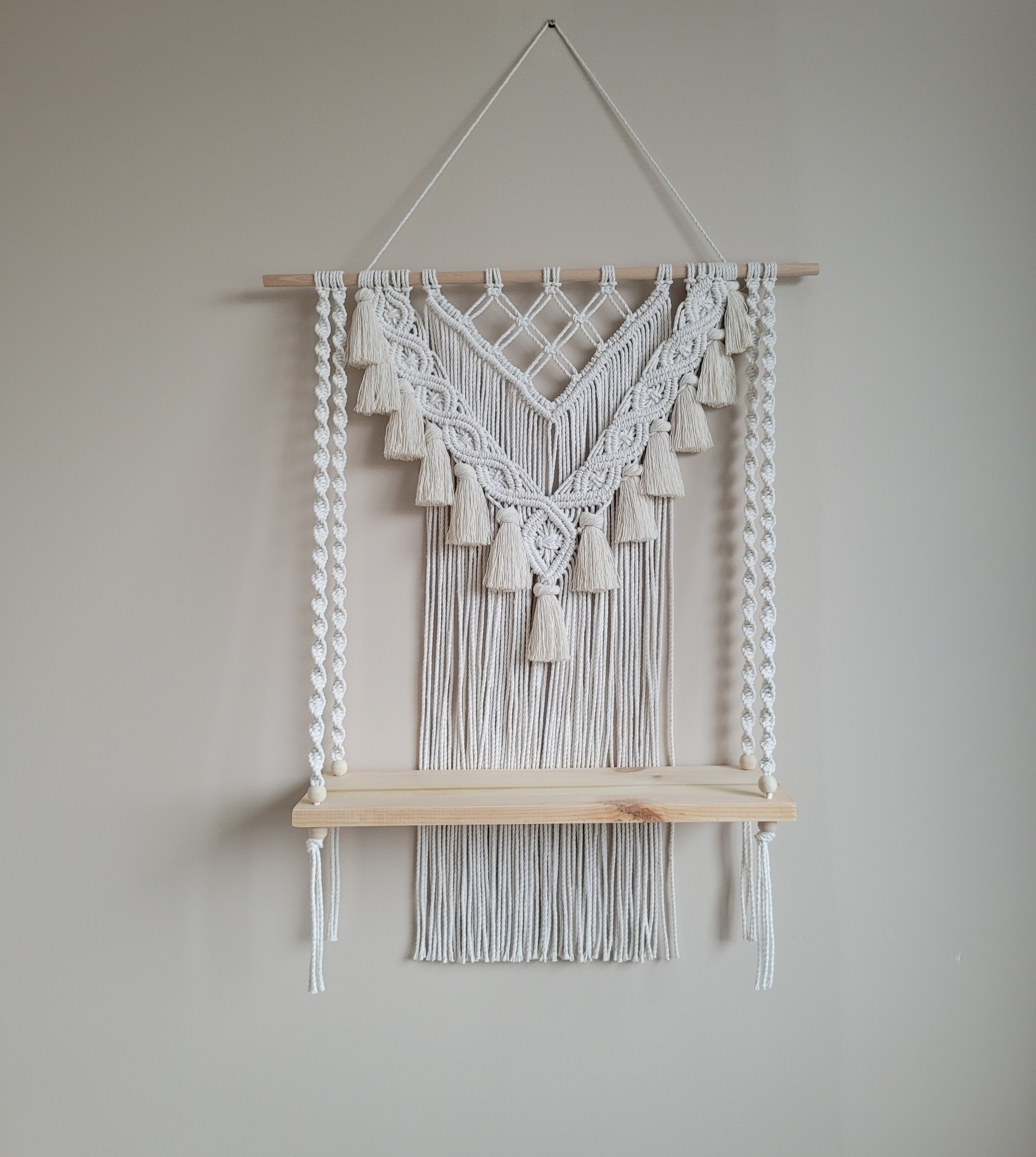 Rankų darbo macrame technika rišta dekoracija + medinė lentyna.