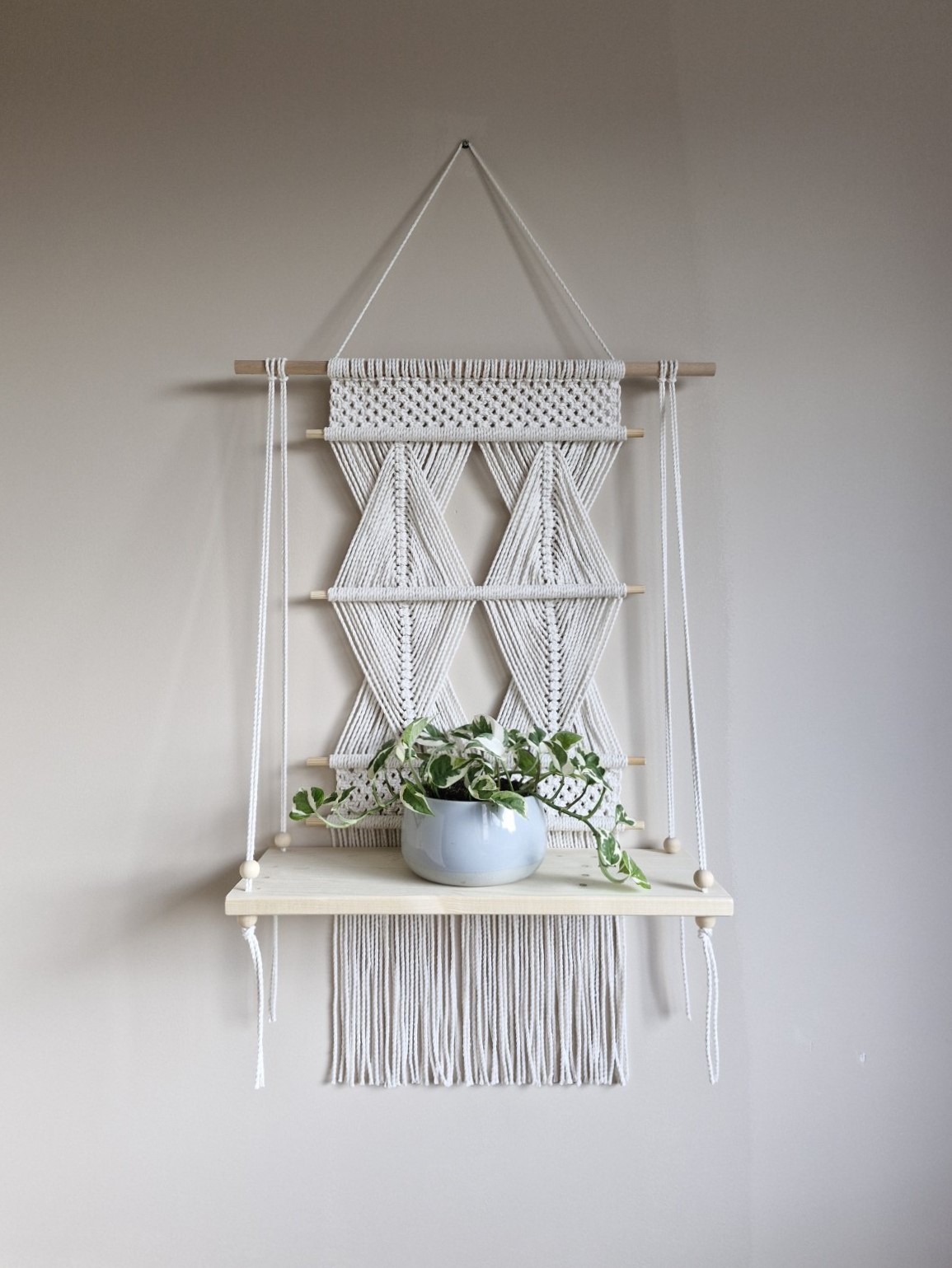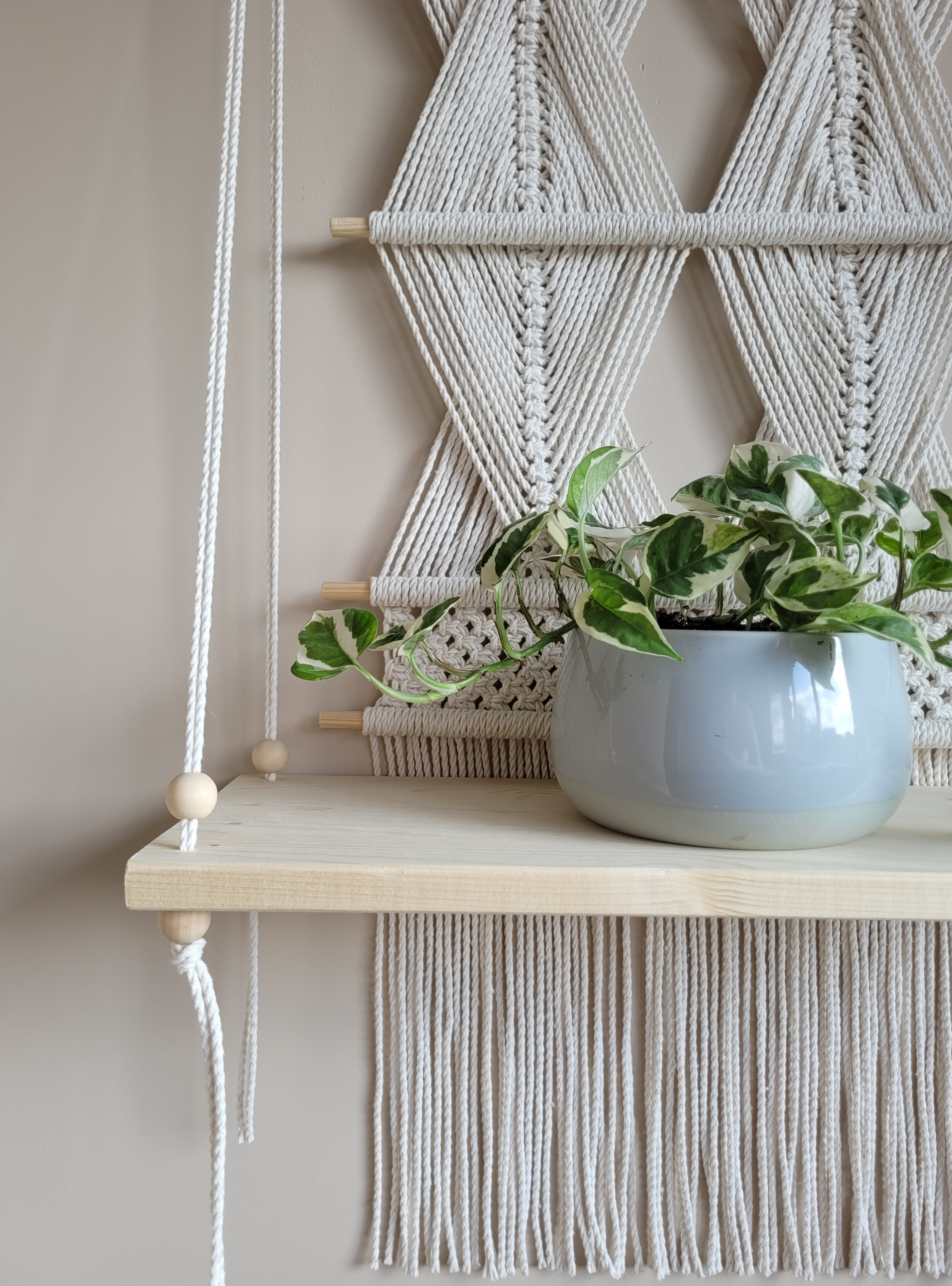 Kurta iš 100 proc. medvilninės virvės, medinių karoliukų ir medinės lentynos. Puikiai tiks pasidėti kambariniui augalui, knygai, žvakei, nuotraukai ar statulėlei.
