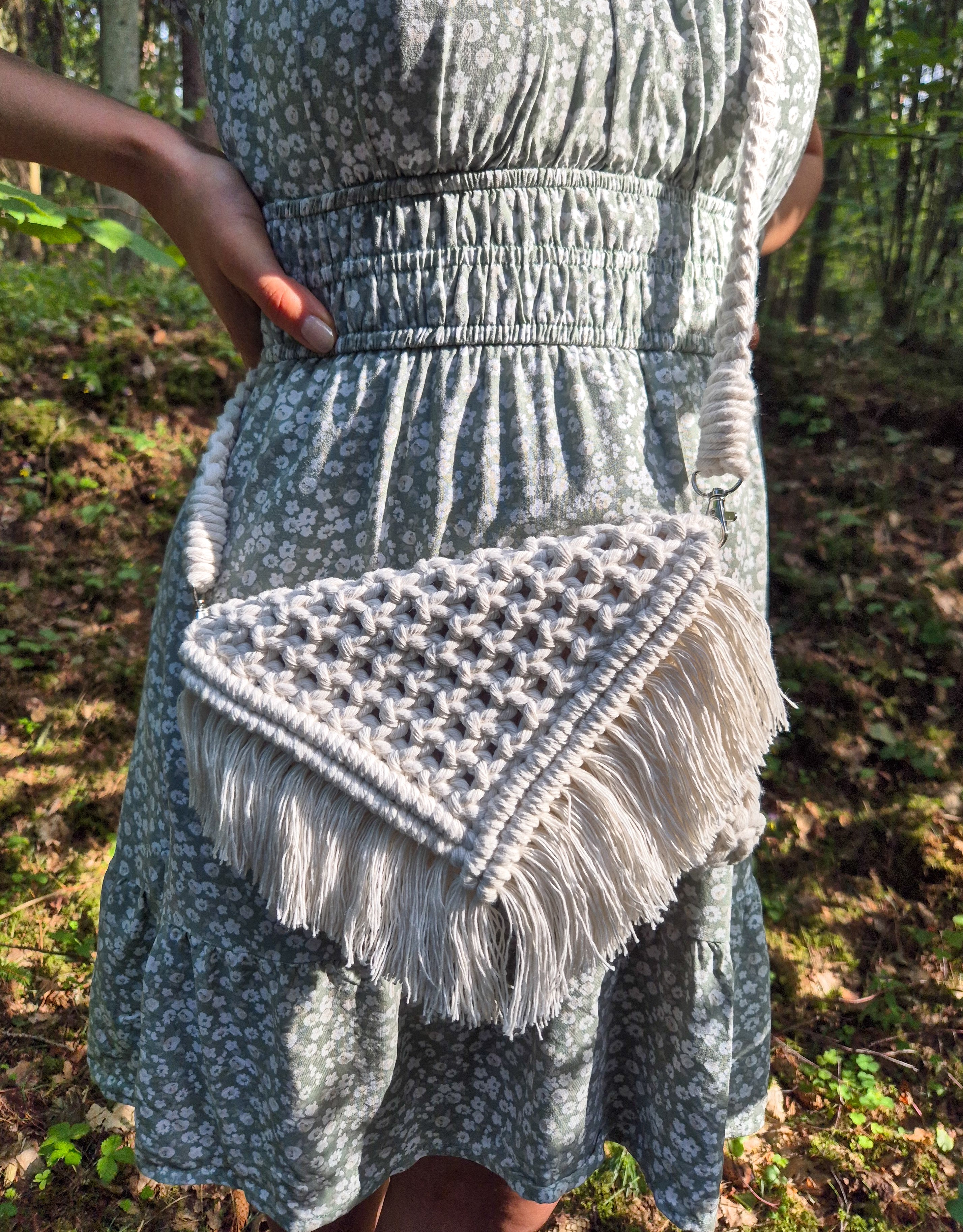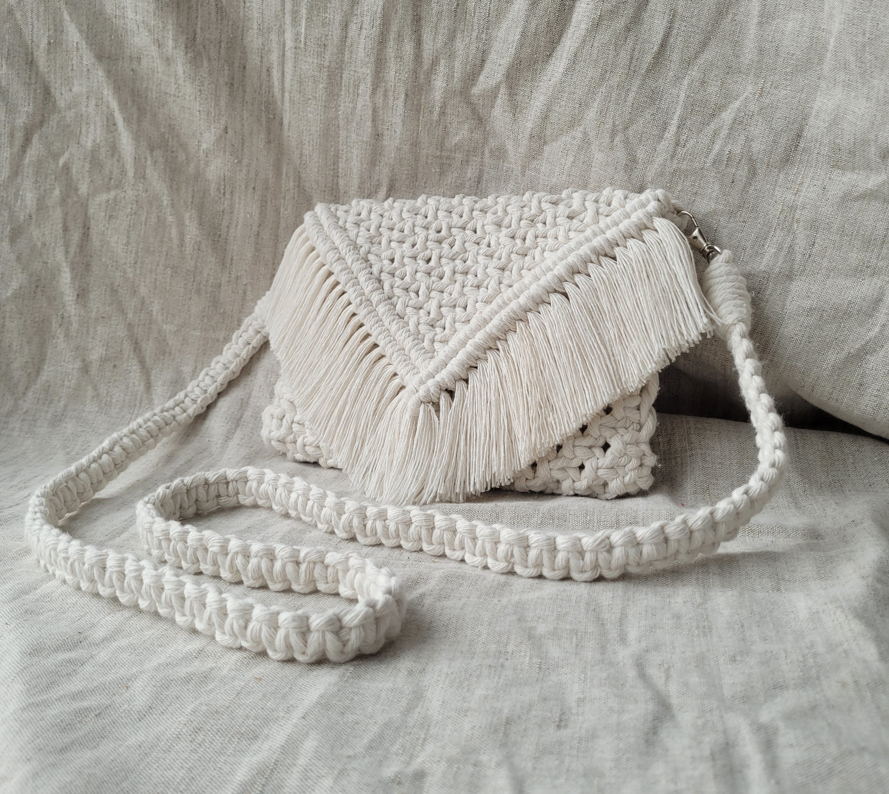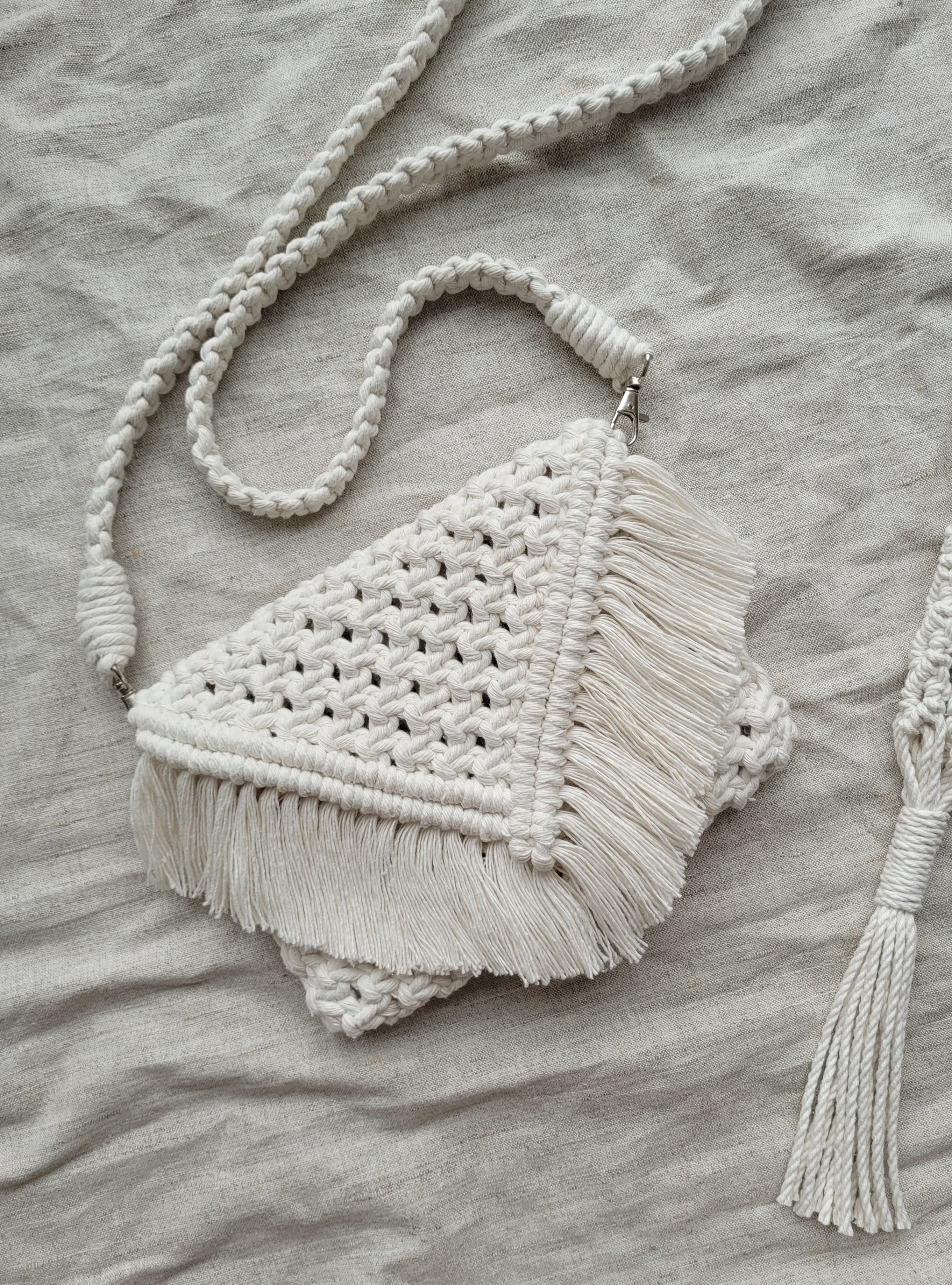 Rankų darbo, macrame technika rišta rankinė. Supinta iš 100 proc. medvilnės siūlų. Yra metalinių detalių - dirželio užsegimai ir rankinės užsegimo detalės.