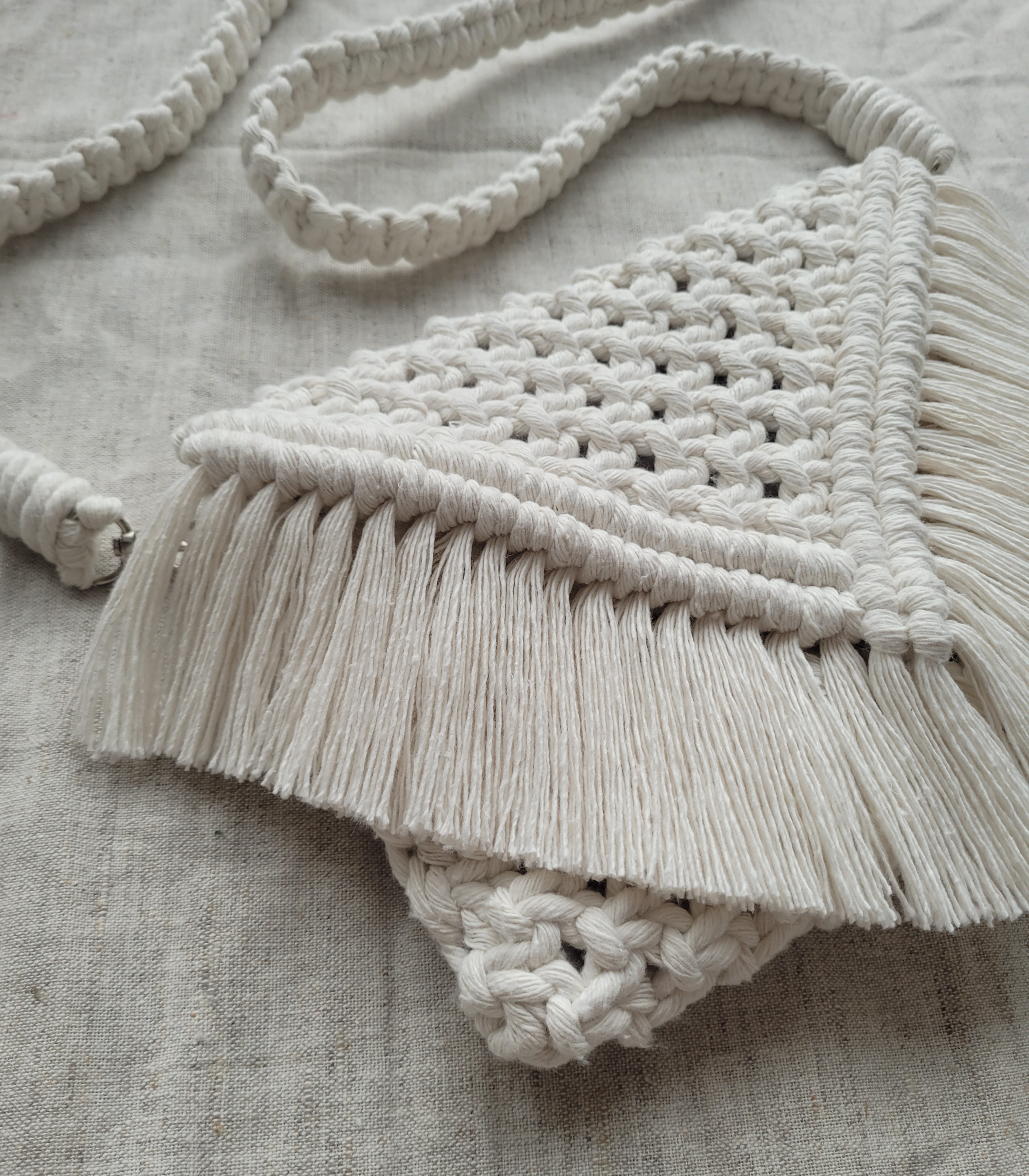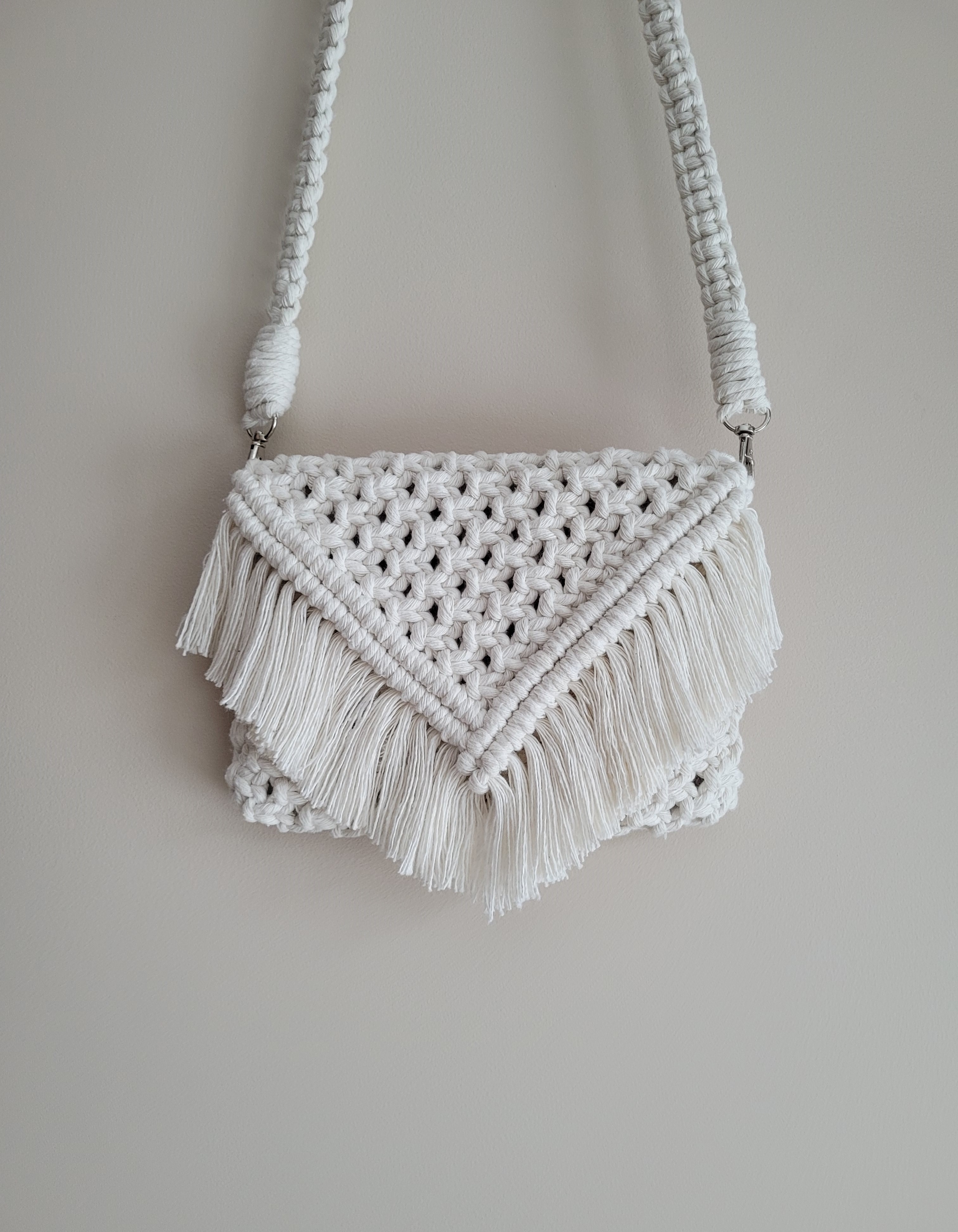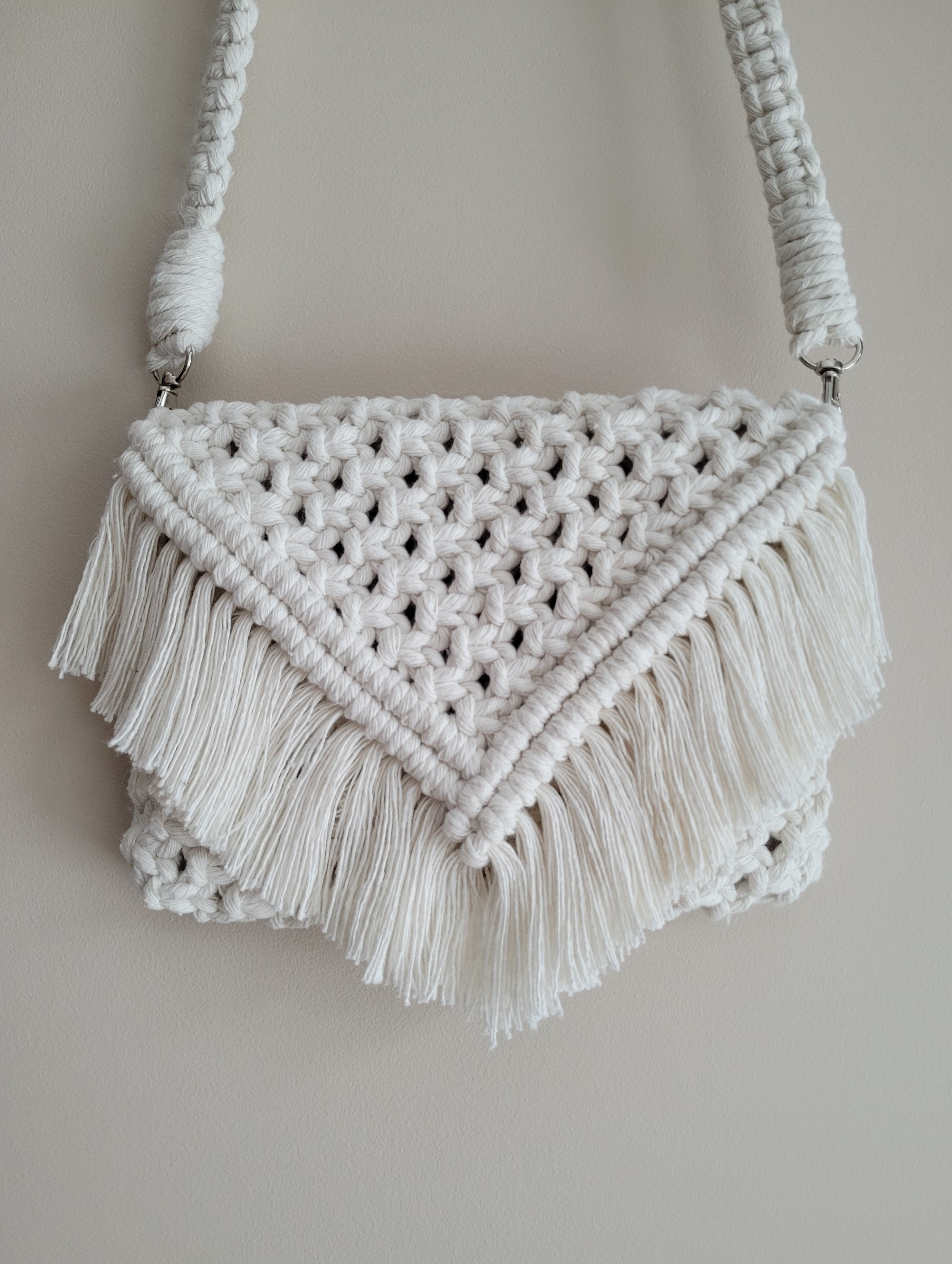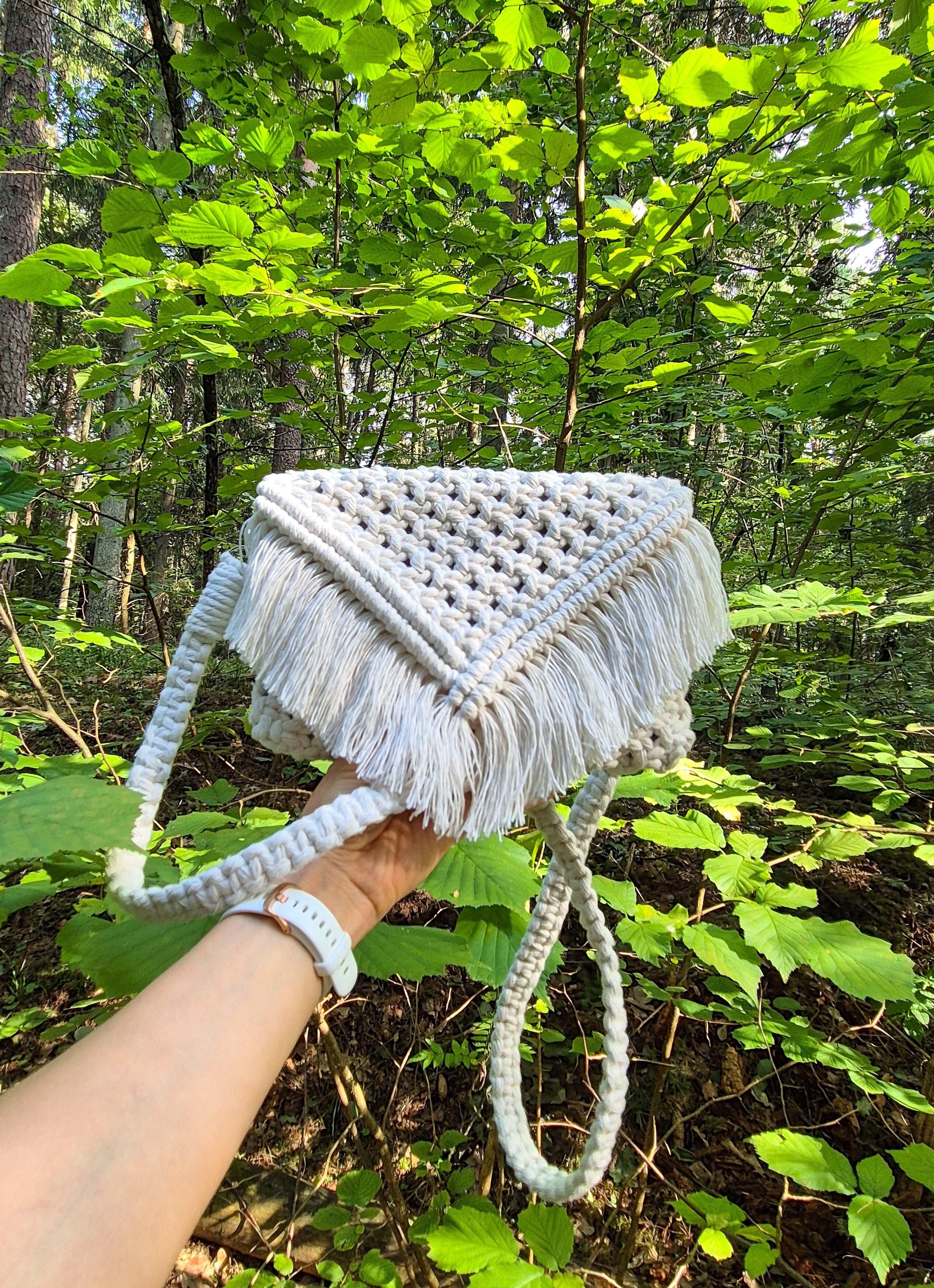 Rankų darbo, macrame technika rišta rankinė. Supinta iš 100 proc. medvilnės siūlų. Yra metalinių detalių - dirželio užsegimai ir rankinės užsegimo detalės.