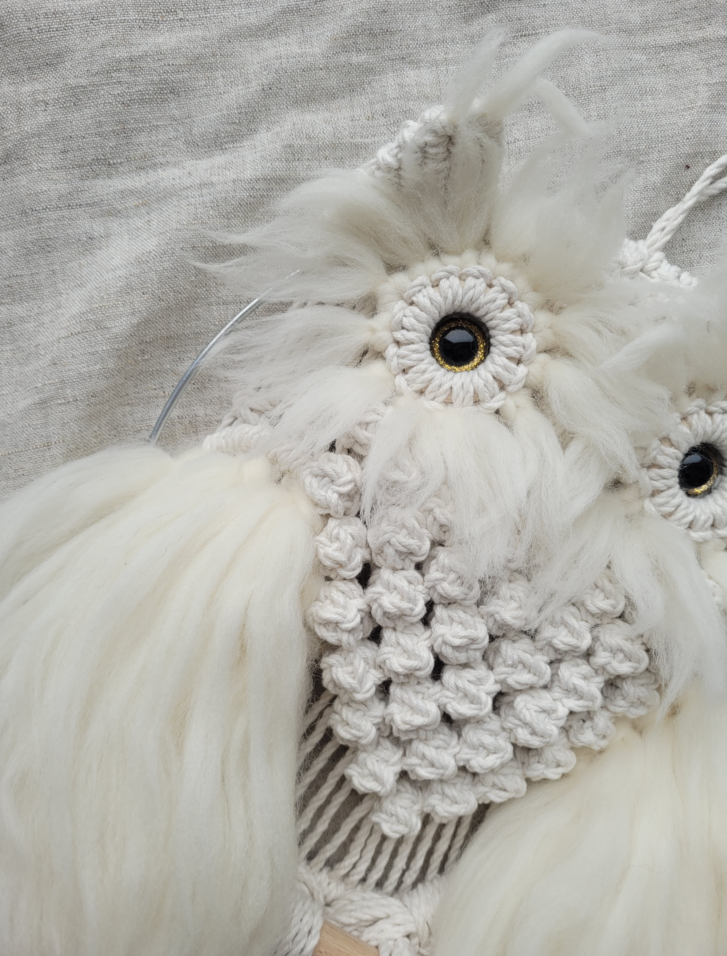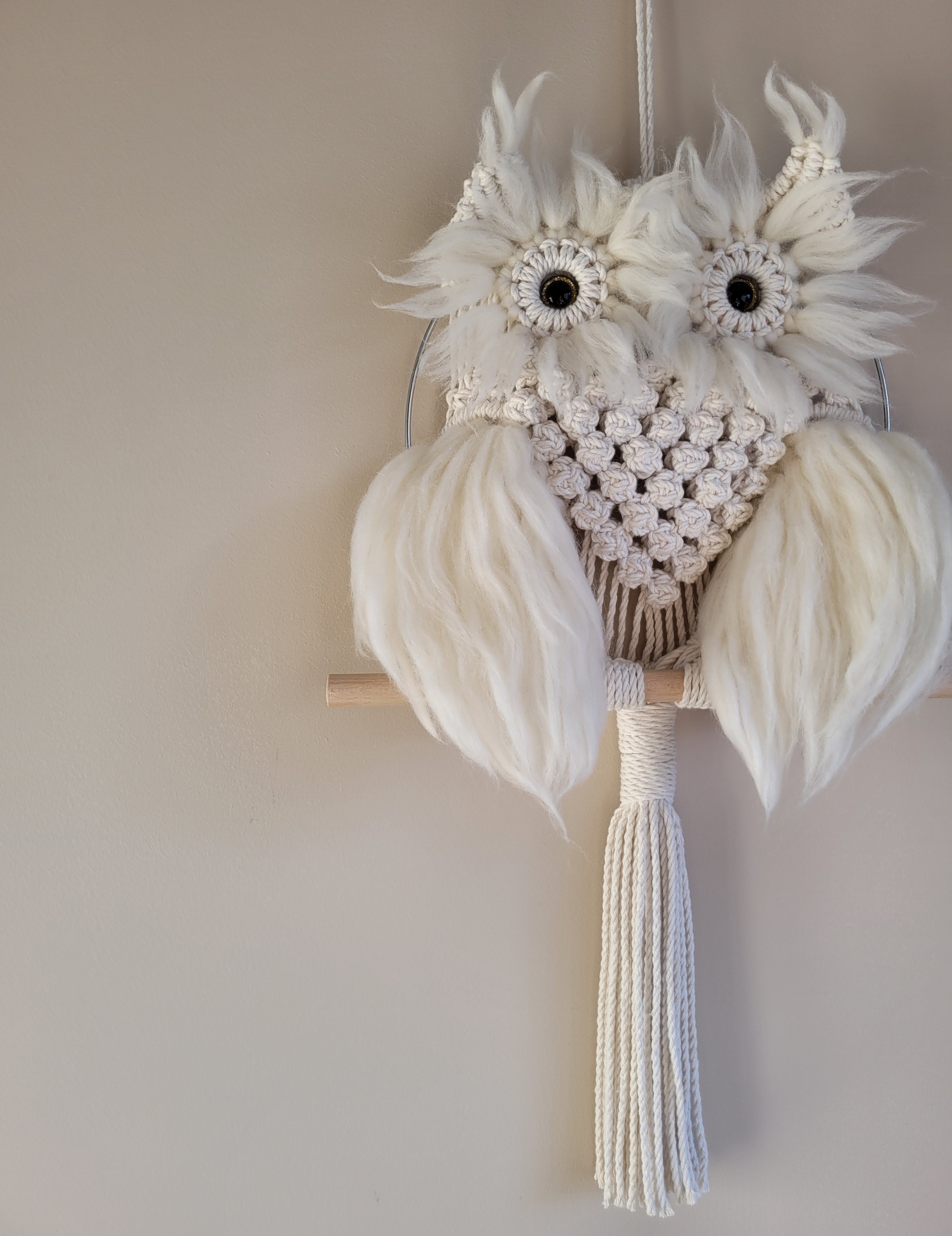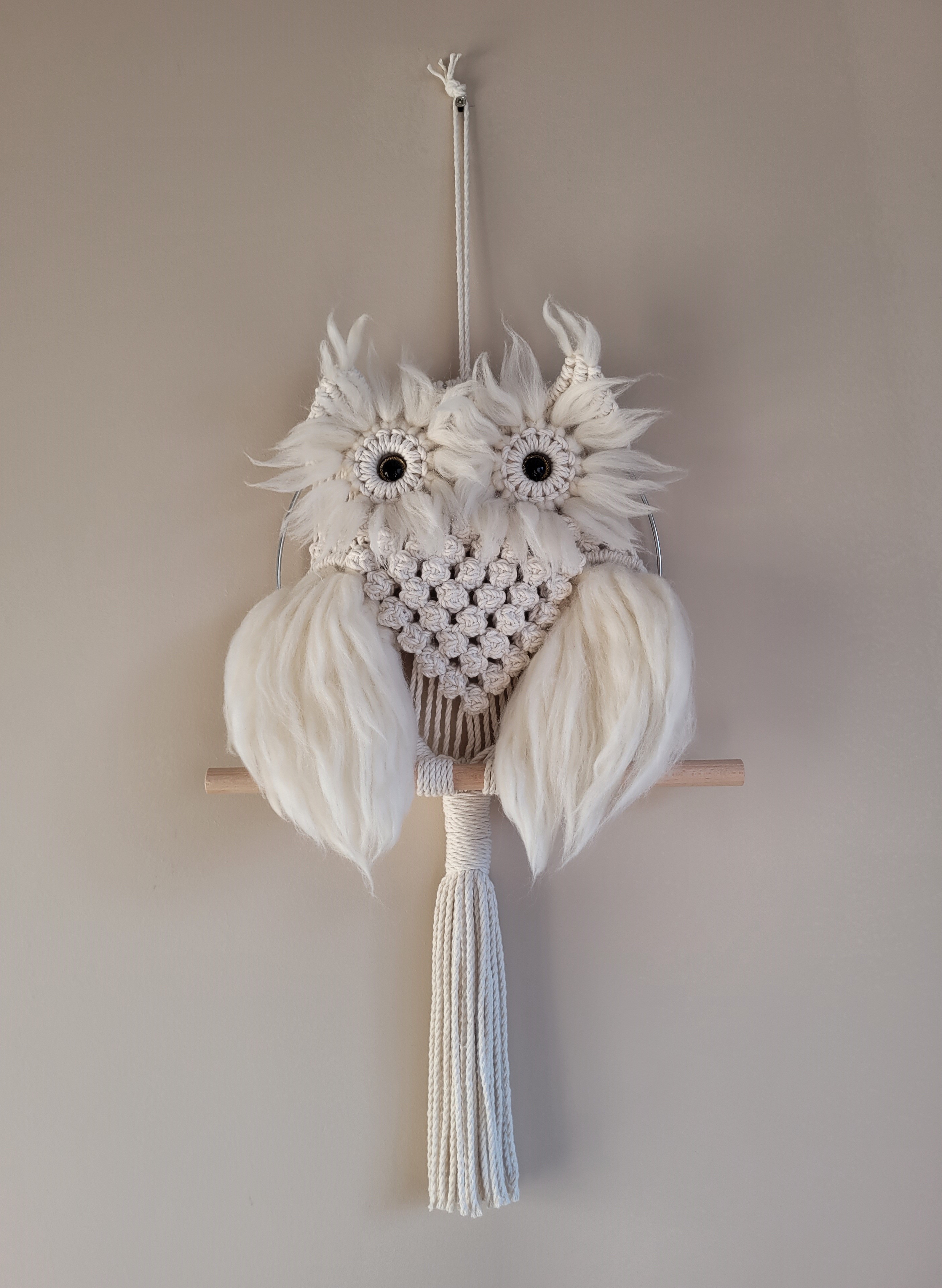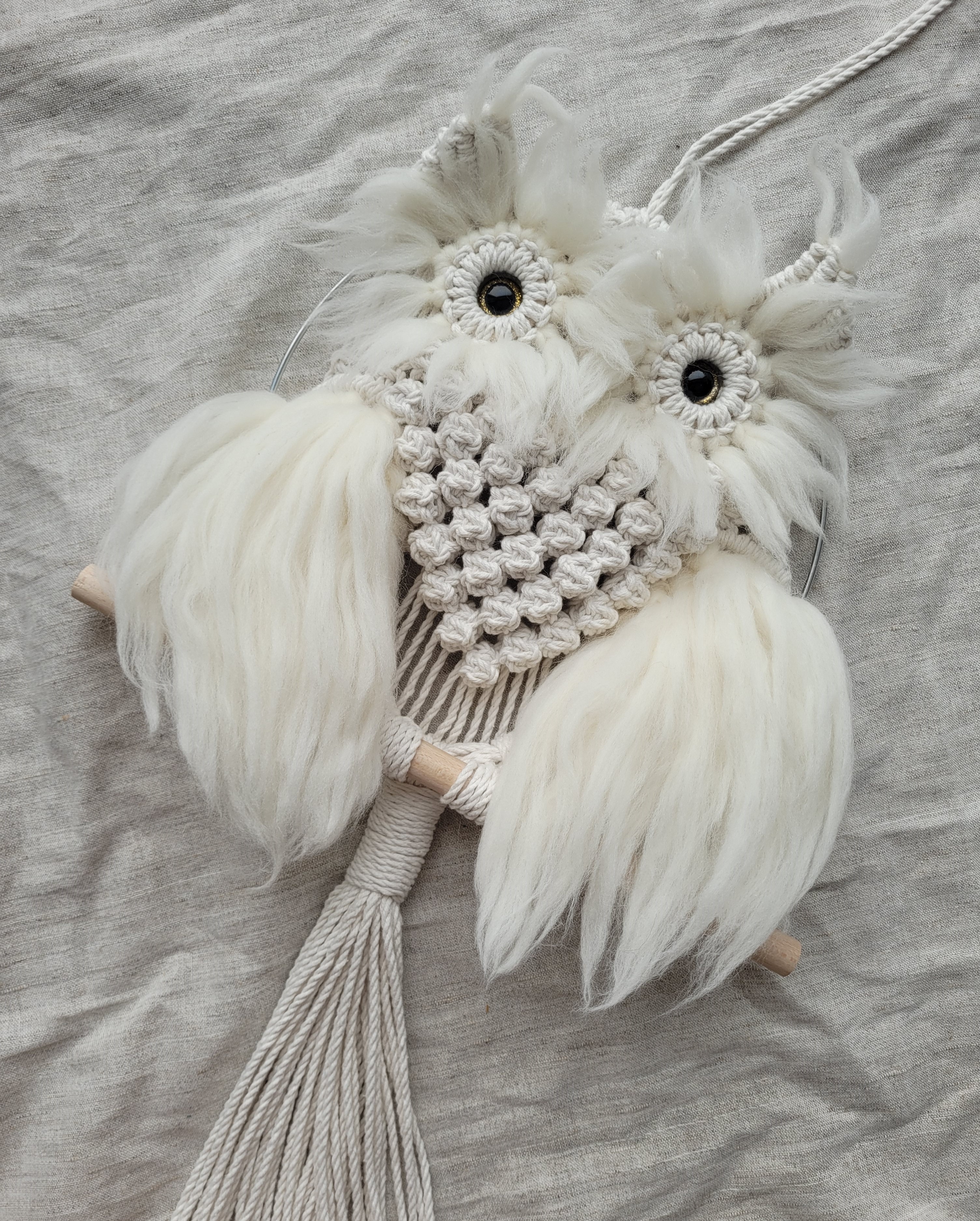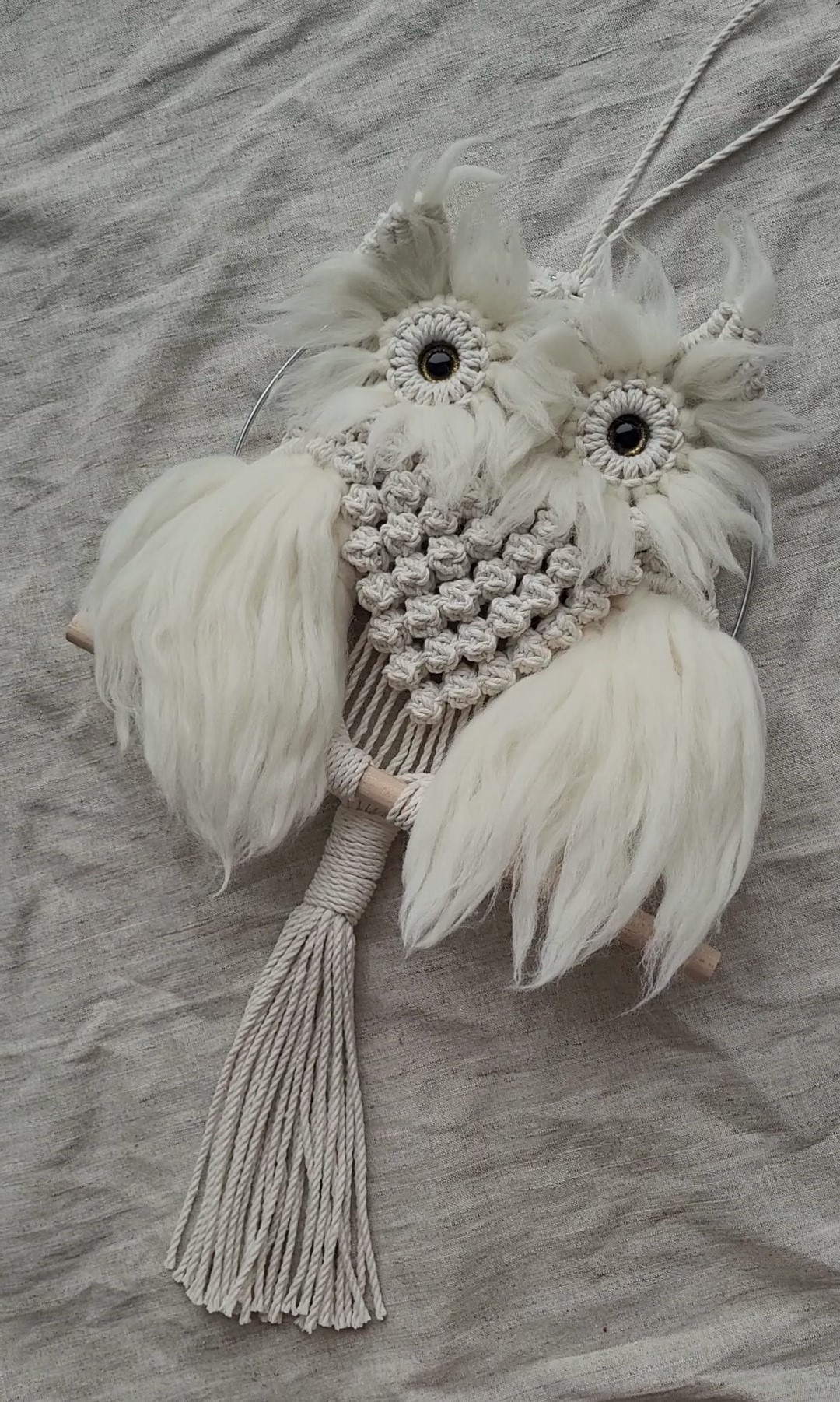 Sukurta iš 100 proc. medvilnės siūlų, vilnos ir metalinio žiedo su mediniu pagaliuku.
